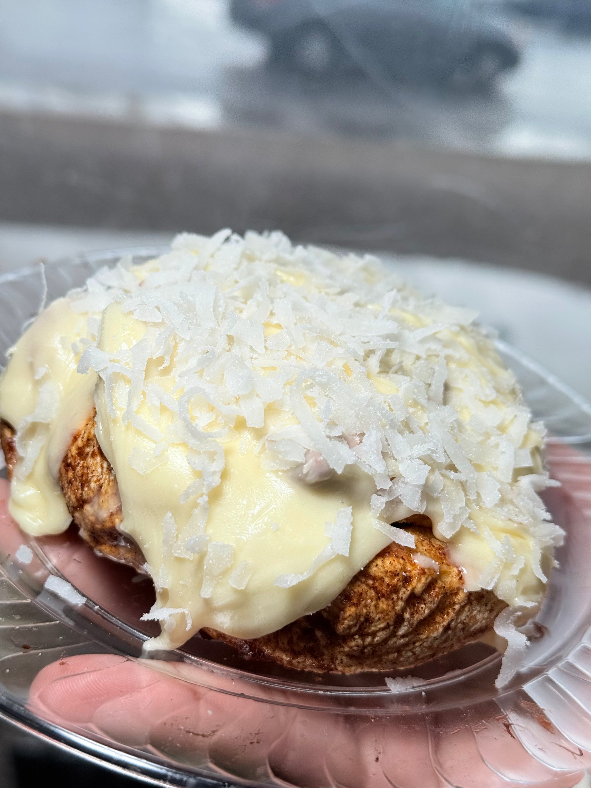Nuestros rollitos de canela bañados coco... son suaves, esponjosos y llenos de sabor. Hechos con ingredientes frescos y de alta calidad, cada rollito viene bañado con un glaseado delicioso que los hace irresistibles.